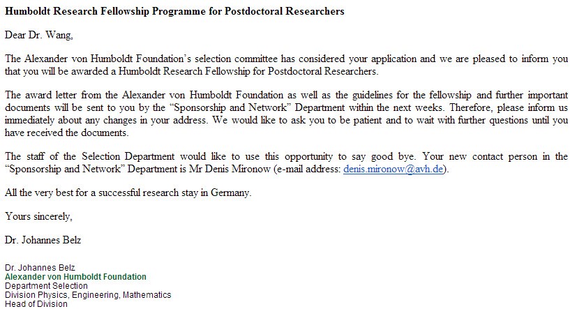 近日,收到德国洪堡基金委员会的通知,由我校航空科学与工程学院邱志平教授指导的博士生王冲获得“洪堡研究基金”(Humboldt Research Fellowship for Postdoctoral Researchers)的资助,将赴德国TU9联盟成员--布伦瑞克工业大学(TU Braunschweig),在著名计算数学专家Hermann Matthies教授的指导下进行为期2年的研究工作。
